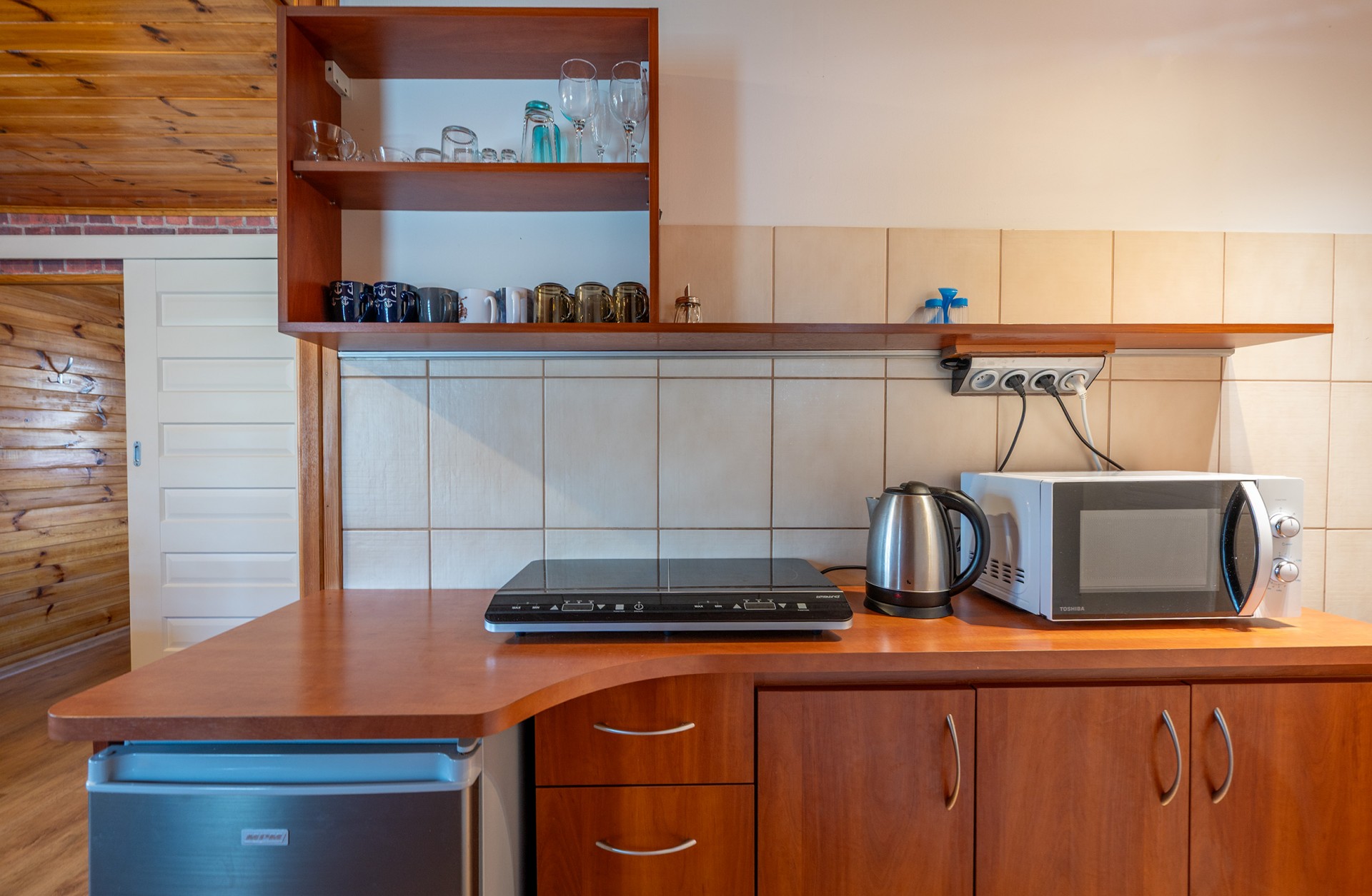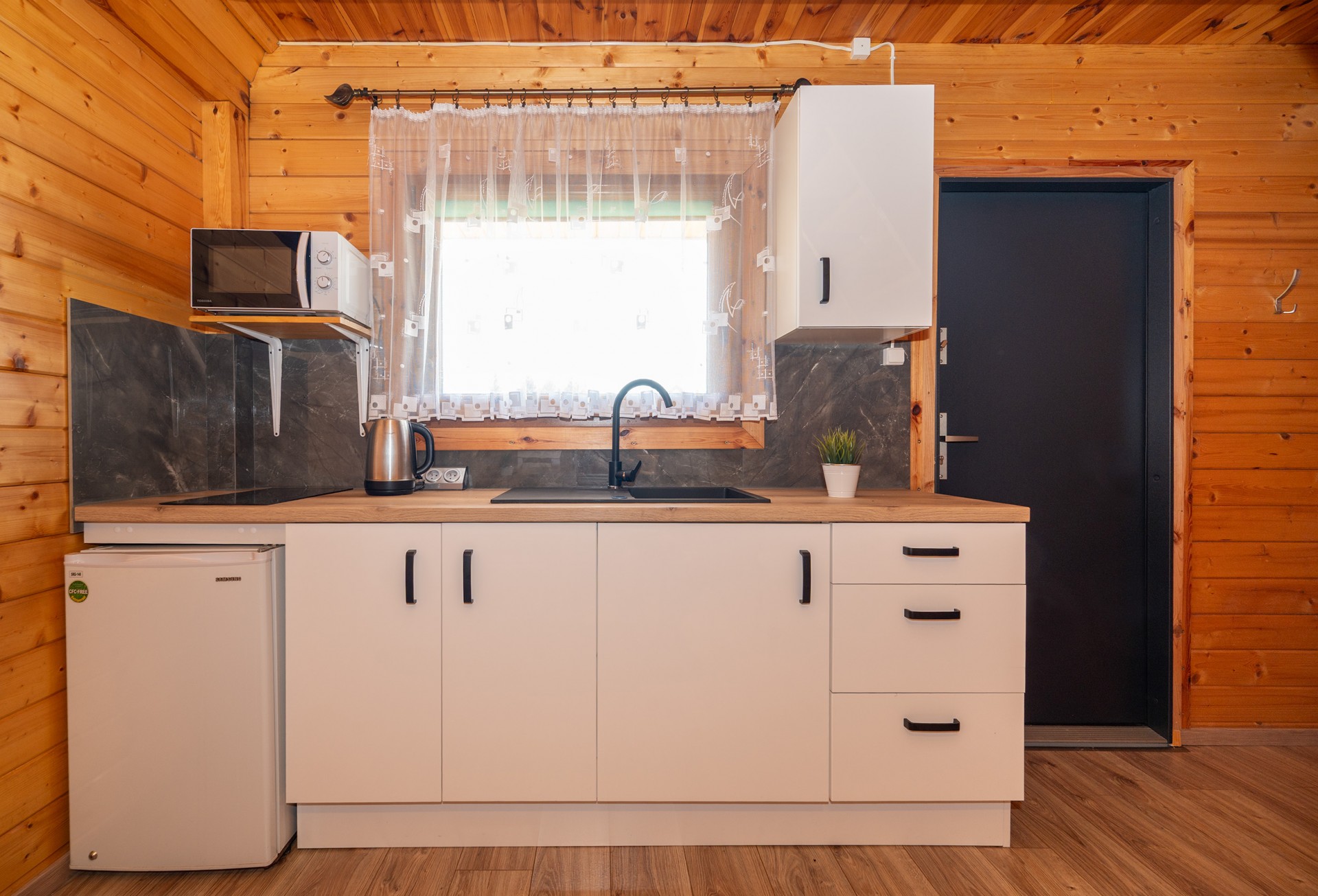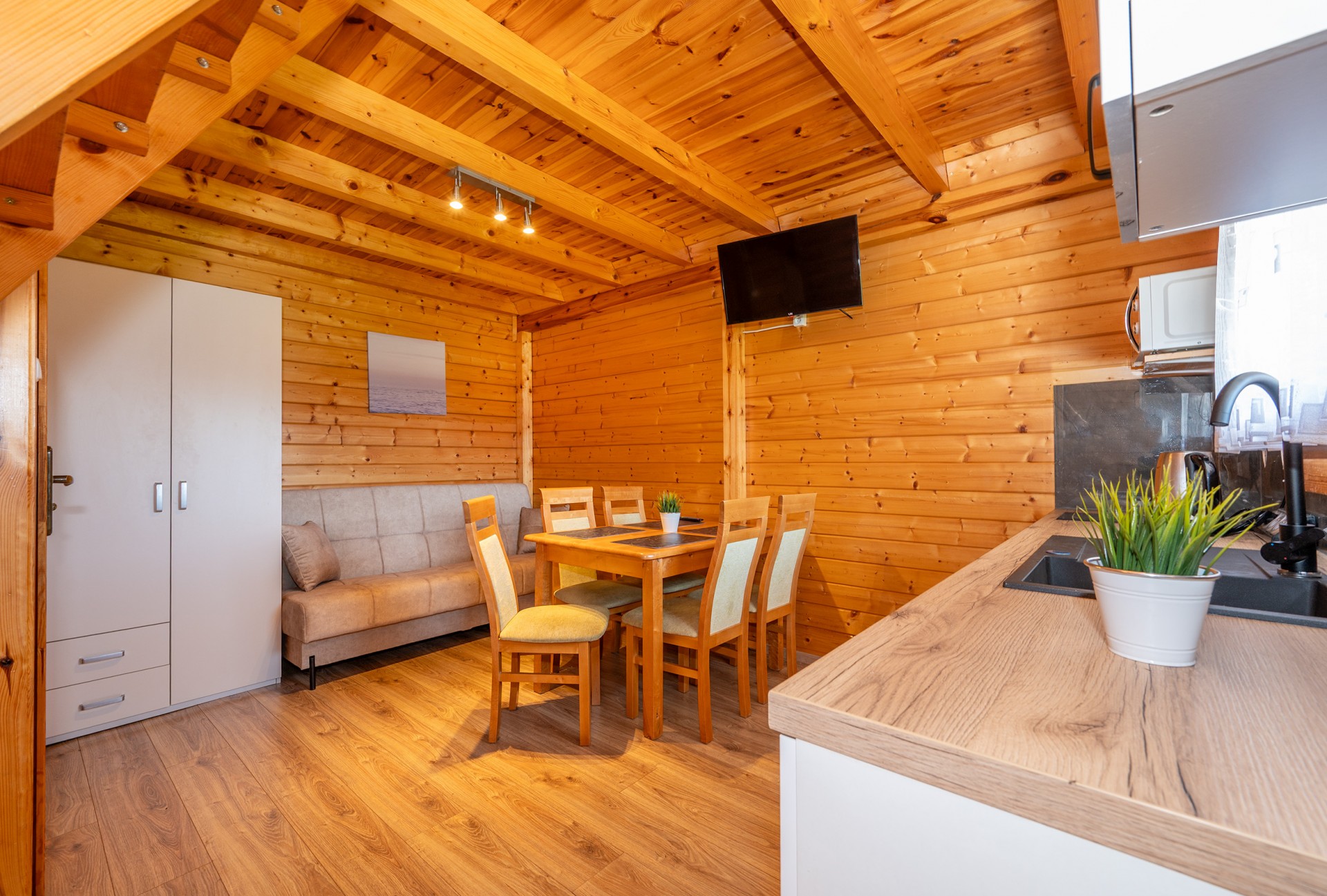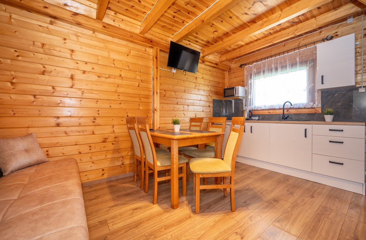 - salonik (wersalka 2-osobowa, TV, drewniany stół + 4 krzesła) z aneksem kuchennym (kuchenka indukcyjna dwupalnikowa, czajnik elektryczny, lodówka, mikrofalówka, komplet naczyń, garnki, patelnia, sztućce)