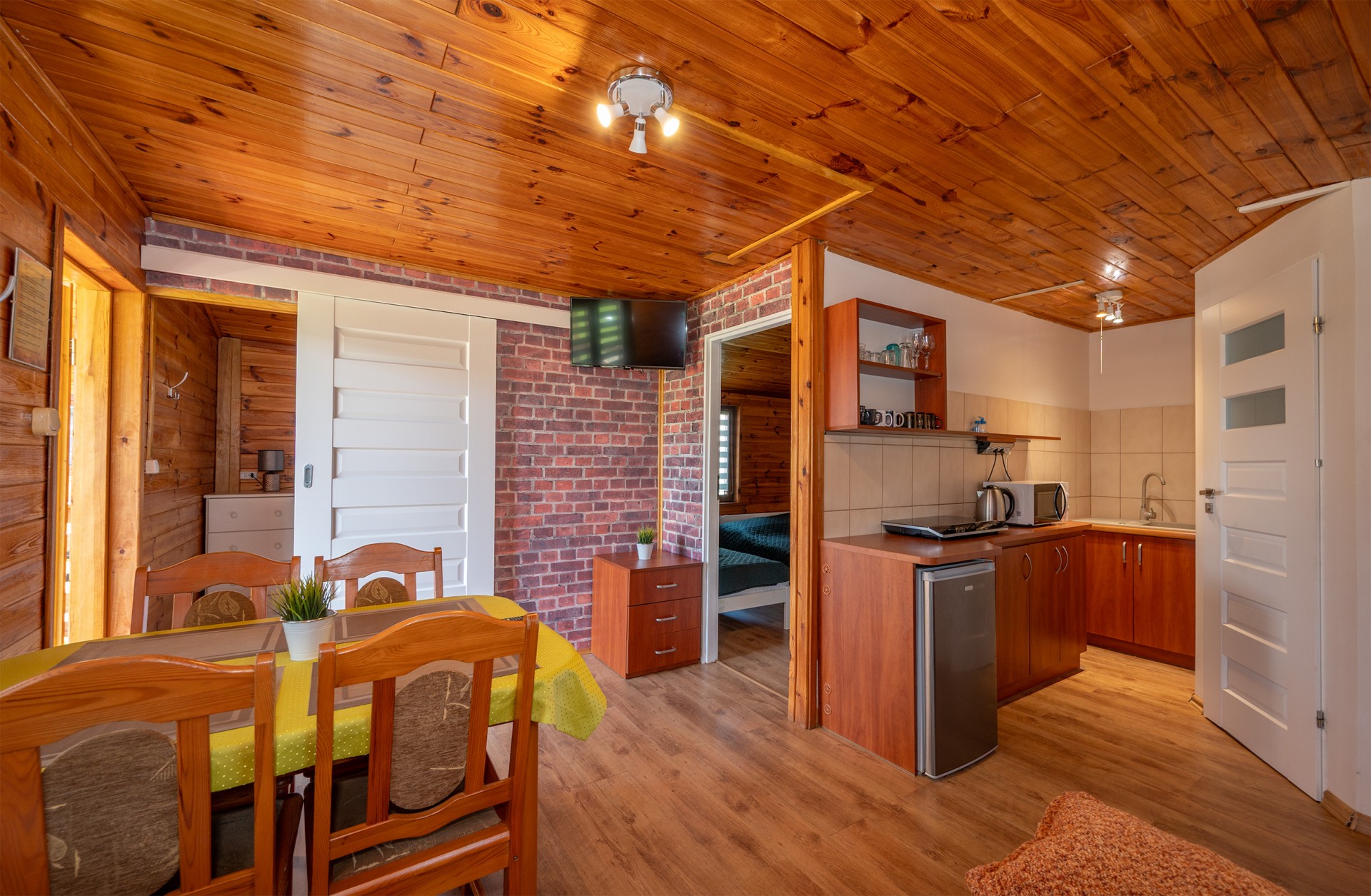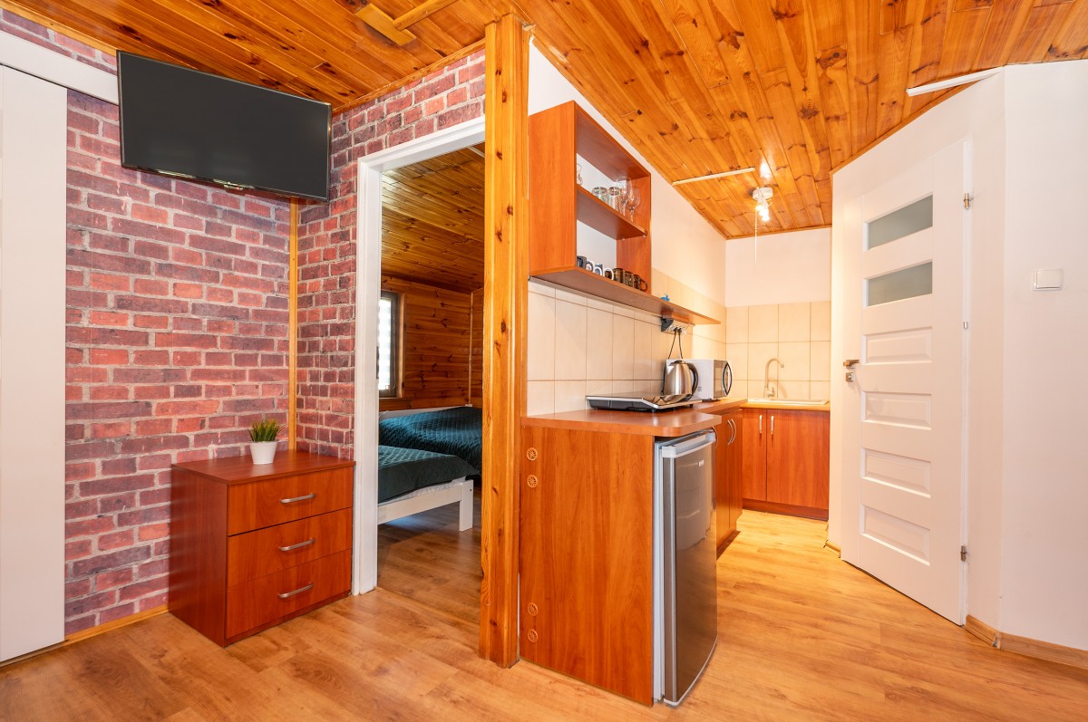 - salonik (wersalka dwuosobowa, TV, drewniany stół + 4 krzesła) z aneksem kuchennym (płyta indukcja, czajnik elektryczny, lodówka, mikrofalówka, komplet naczyń, garnki, patelnia, sztućce)